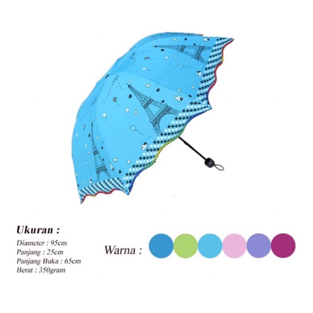 Payung ini merupakan produk TERLARISDetail Produk :-rangka hitam 4 lantai kokoh anti karat dan anti angin-diameter payung saat terbuka 95cm- panjang waktu dilipat 25 cm-Ada lapisan silver berfungsi untuk anti UV yang melindungi pemakai dari paparan sinar matahari-pinggir kain bergelombang warna warni / pelangi-FREE BUBBLEWARP sehingga aman sampai di tempat AndaWarna:Pink FantaHijauToscaBiru TuaBiruPink MudaMohon berikan VARIASI ALTERNATIF/CANCEL bila variasi yg dipilih kosong. Bila tidak ada, akan dikirim RANDOM sebagai penggant