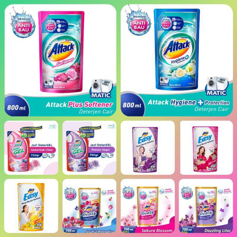 ATTACK Liquid Pouch RefillAttack merupakan brand deterjen produksi Kao Corporation Jepang. Di Indonesia, Attack diproduksi oleh PT Kao Indonesia yang hadir dalam berbagai brand yakni Attack, Easy, dan Jaz 1 yang hadir untuk memenuhi kebutuhan berbagai segmen. Diproduksi dari bahan berkualitas dengan teknologi Jepang, deterjen bubuk maupun cair persembahan Kao akan senantiasa menemani keluarga Indonesia untuk mencuci dan merawat pakaian secara menyeluruh.Rawat pakaian Anda dengan selalu mencucinya menggunakan rangkaian produk deterjen Attack. Deterjen berkualitas yang ramah lingkungan persembahan dari Kao ini dirancang untuk mencuci dan merawat pakaian secara menyeluruh. Kini hadir Attack Liquid yang merupakan deterjen cair konsentrat untuk segala jenis mesin cuci yang dapat larut dengan sempurna hingga ke serat kain. Dengan Attack Liquid pakaian akan menjadi bersih, anti kuman, dan bebas noda.Anti KumanAttack Liquid dapat mencegah timbulnya bakteri dan bau apek pada pakaian.Petunjuk Penggunaan- Mesin Cuci Pintu Atas 1 Tabung: ½ tutup botol (30ml) untuk penggunaan air 30 liter (15-20 potong pakaian)- Mesin Cuci Pintu Atas 2 Tabung: ¾ tutup botol (45ml) untuk penggunaan air 45 liter (20-25 potong pakaian)- Mesin Cuci Pintu Depan: ¼ tutup (15ml) untuk penggunaan 10-15 potong pakaian- Mesin Cuci Pintu Depan: ½ tutup botol (30ml) untuk penggunaan 15-25 potong pakaian- Takaran dapat disesuaikan dengan tingkat kekotoran pakaianDetail:- Deterjen cair konsentrat dengan formula 3D Clean Action- Membuat pakaian putih cemerlang- Anti kuman, menjadikan pakaian tidak bau apek- Angkat noda dengan tuntas- Mengandung Surfaktan utama 15.4%, Anti Kuman 0.02%- Kemasan kantong- Cocok untuk semua jenis mesin