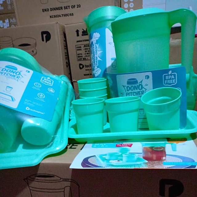 TECHNOPLAST DONO PITCHER SET OF 8 PCS....Eskan yang memudahkan Anda untuk menyajikan minuman segar untuk kumpul bersama. Cocok juga untuk menjamu tamu yang datang ke rumah. Kumpul bersama jadi lebih ceria dan meriah bersama Dono Pitcher Set of 8 Pcs.Kenapa jadi jagoan??- 1 set Dono Picher set sudah LENGKAP isinya.Ada pitcher uk. 2.2 L, 6 gelas dan nampan.. Kumplittt dan Praktis.- Harganya SUPER terjangkau, dijamin gak bikin kantong bolong <> Apa saja yang Anda dapatkan dalam 1 set- 1 Pitcher uk. 2.2 L , bisa buat minum seluruh keluarga- 6 gelas uk. 245 ml, banyak dan ideal untuk disajikan waktu kumpul2- 1 nampan yang pas buat 6 gelas. PRAKTIS!!Keunggulan produk :- Desain simple dengan warna hijau tosca yang FRESH- Penutup pitcher yang memudahkan saat buka tutup- Pegangan di sisi pitcher- Material plastik PP5 dan Food Grade, sehingga aman untuk minuman- Freezer Safe, aman dimasukkan ke dalam freezer untuk mendinginkan minuman.Gimana? Tertarik pengen punya? Ak kasih mur